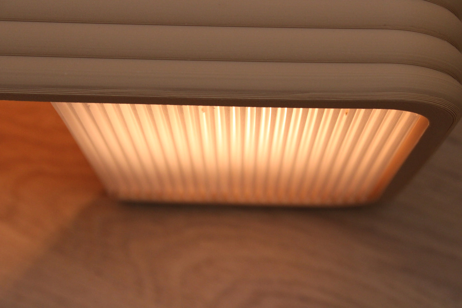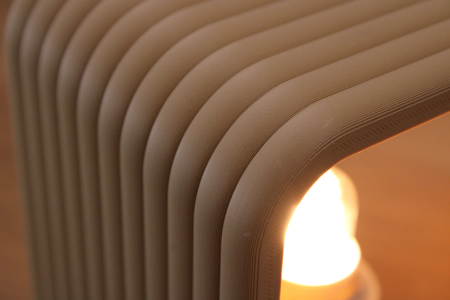 Fabriqué par impression 3D avec filament PLA effet bois. Les stries horizontales créent l'effet lamelles et permettent une diffusion douce de la lumière. Épaisseur de paroi optimisée pour la solidité et la translucidité.