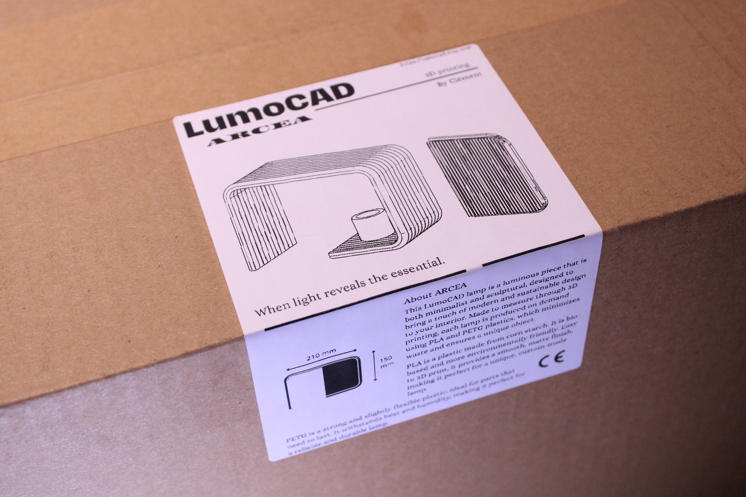 Étiquette de colis personnalisée pour chaque commande LumoCAD ARCEA. Design minimaliste présentant la lampe architecturale avec son slogan "When light reveals the essential." Intègre les informations produit, dimensions et certification CE pour une expérience de déballage soignée.