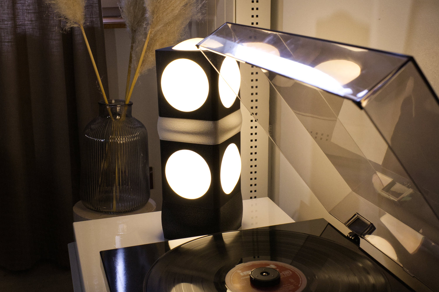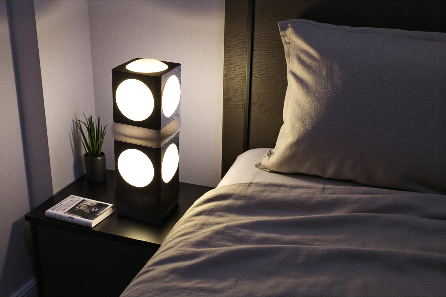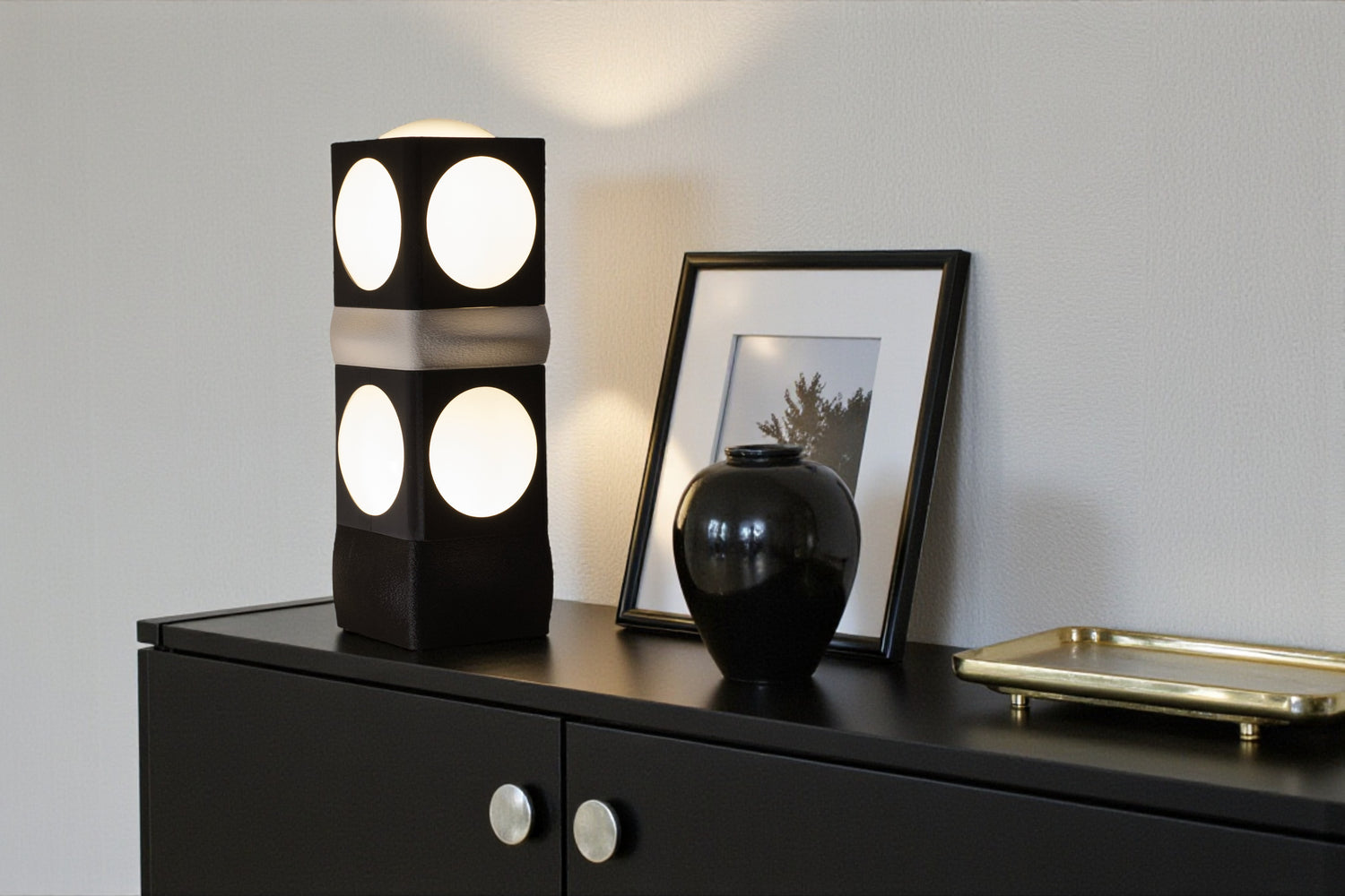 Cette lampe de table au design graphique présente une structure cubique empilable en noir mat avec de grands cercles lumineux blancs sur chaque face. Son style architectural et géométrique crée un effet visuel saisissant tout en diffusant une lumière douce et chaleureuse, parfaite comme lampe d'appoint dans un salon ou une chambre.