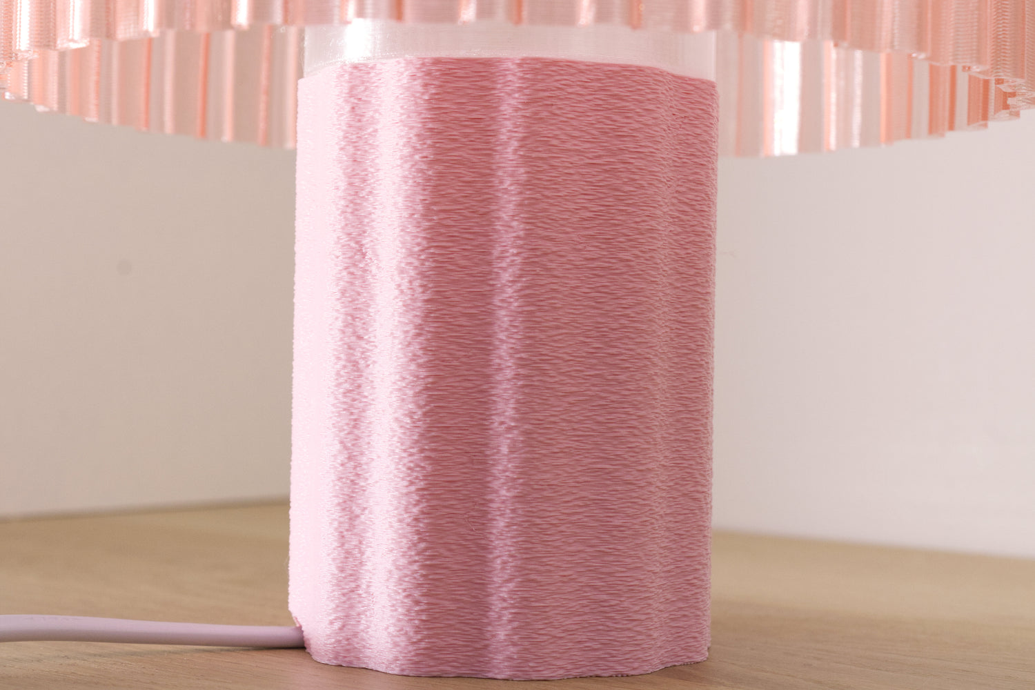 Fabriqué par impression 3D avec filament PLA et PETG. Les stries horizontales créent l'effet lamelles et permettent une diffusion douce de la lumière. Épaisseur de paroi optimisée pour la solidité et la translucidité.